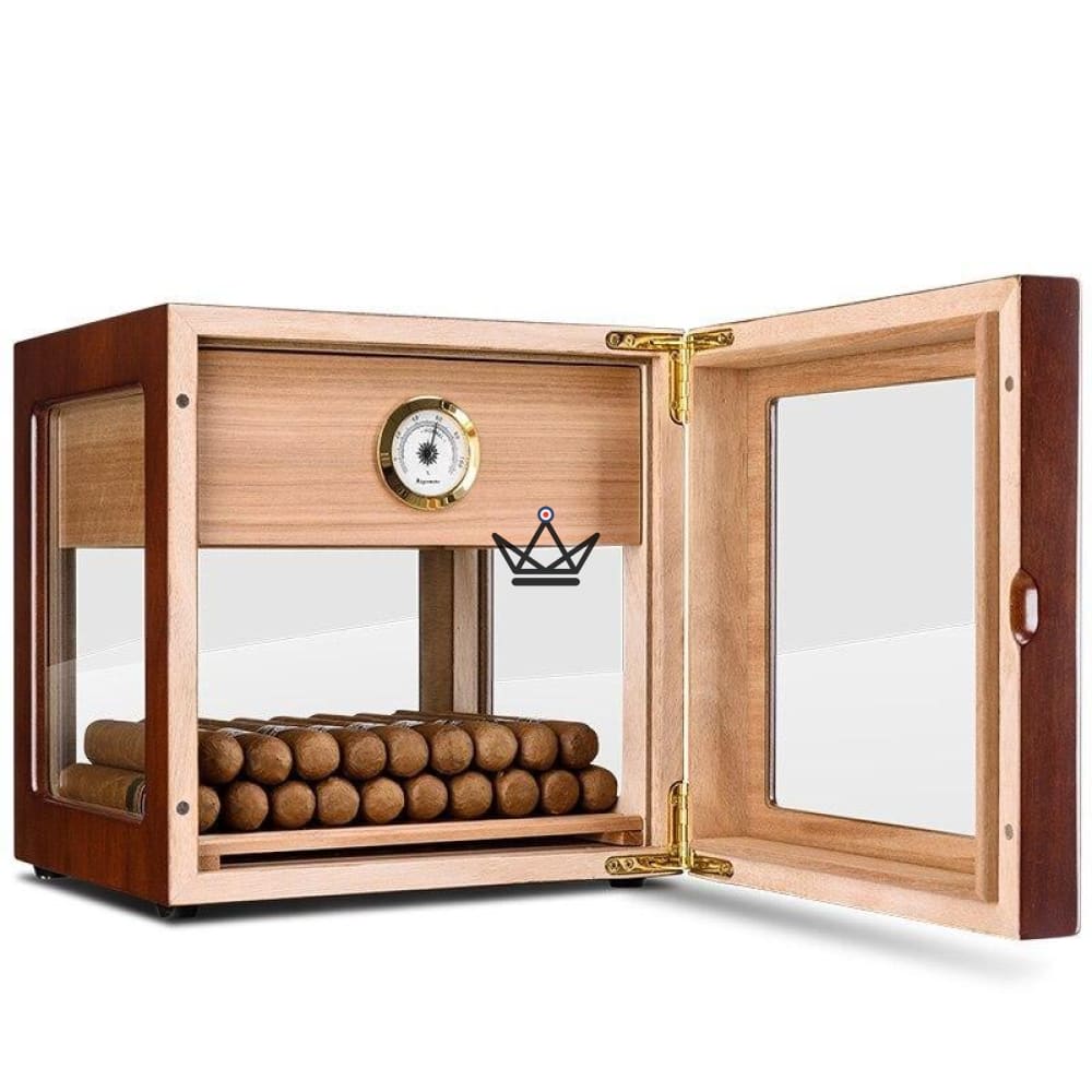 Der Zigarren-Humidor CRYSTAL CUBE ist mit einer oberen Schublade ausgestattet, die bis zu 30 Zigarren aufnehmen kann, und verfügt außerdem über ein integriertes Hygrometer an der Außenseite, um die Luftfeuchtigkeit im Inneren des Humidors zu überwachen. Dank seiner Konstruktion aus spanischem Zedernholz gewährleistet er eine optimale Lagerung Ihrer Zigarren, indem er eine stabile und feuchte Umgebung aufrechterhält.