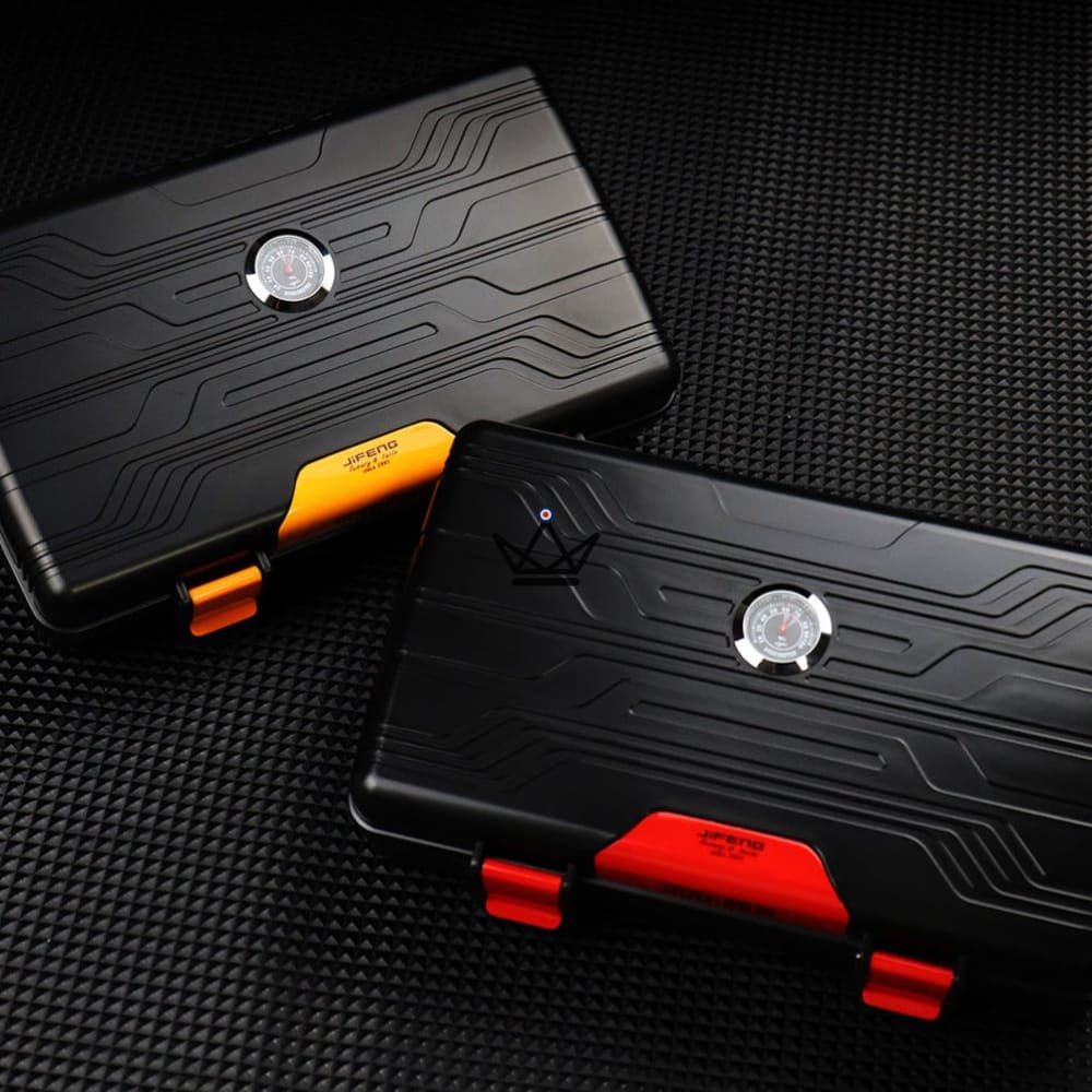 Dieser in den Farben Schwarz und Rot/Orange erhältliche Reisehumidor vereint Funktionalität und Stil. Dank ihrer kompakten Größe von 21,5 x 12,3 x 5,5 cm können Sie sie problemlos in Ihre Tasche oder Ihren Koffer stecken, und ihr schlankes Design macht sie zu einem attraktiven Accessoire für Zigarrenliebhaber unterwegs.