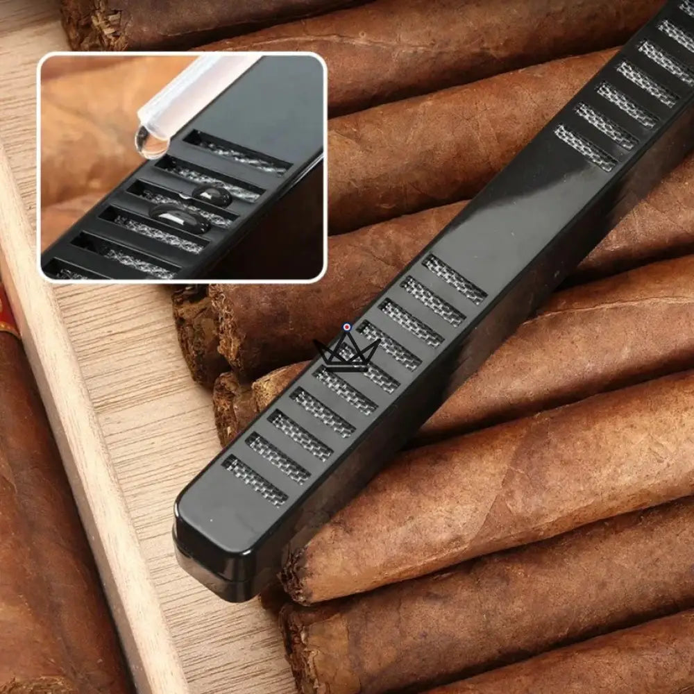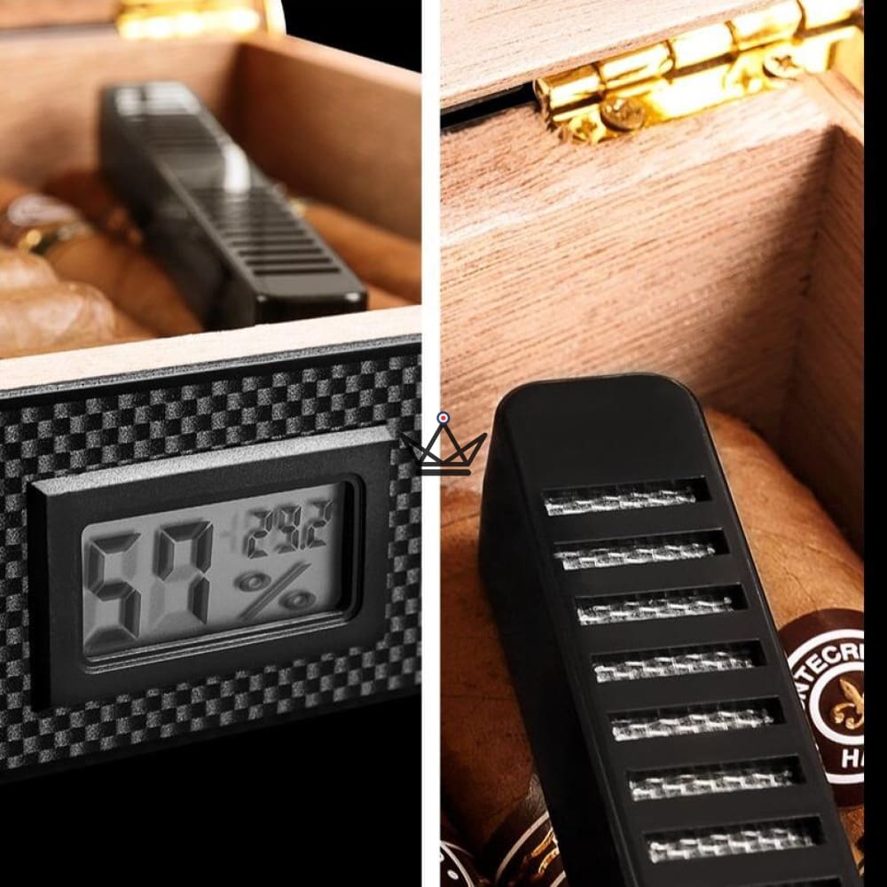 Das diskret in die Fassade eingelassene elektronische Hygrometer bietet Ihnen den Luxus, die Luftfeuchtigkeit im Inneren zu überwachen, ohne den Humidor öffnen zu müssen, und sorgt so für eine perfekte Konservierung Ihrer Zigarren. Ein im Lieferumfang enthaltener Luftbefeuchter sorgt für die ideale Atmosphäre, um den Reichtum und die Komplexität jeder Zigarre zu bewahren.