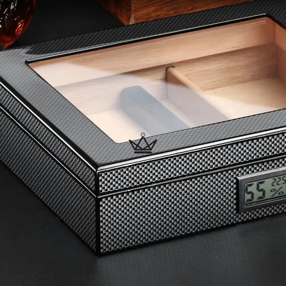Jedes Detail des CARBON soll beeindrucken. Ihr avantgardistisches Design wird durch eine Carbonfaserbeschichtung verstärkt und verleiht dieser Box ein ebenso edles wie robustes Erscheinungsbild. Durch das integrierte Glasfenster im Deckel können Sie Ihre wertvollen Zigarren bewundern, ohne deren Ruhe zu stören.