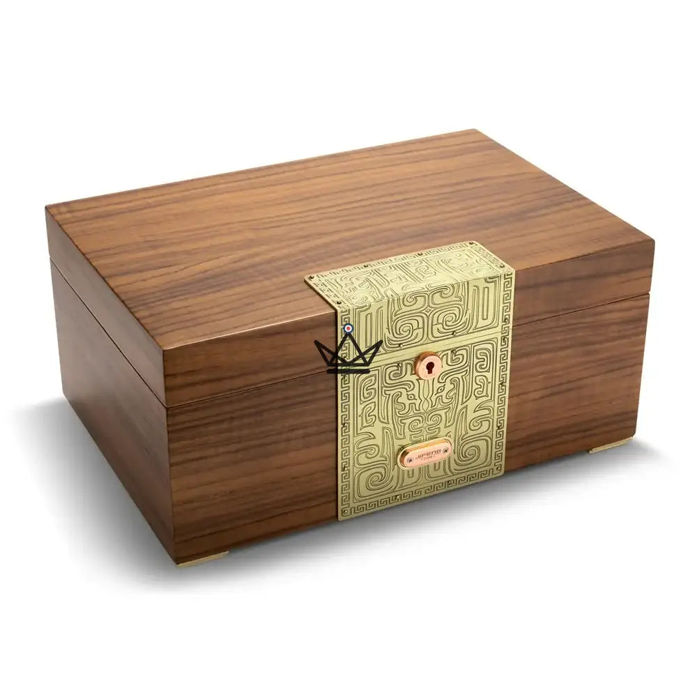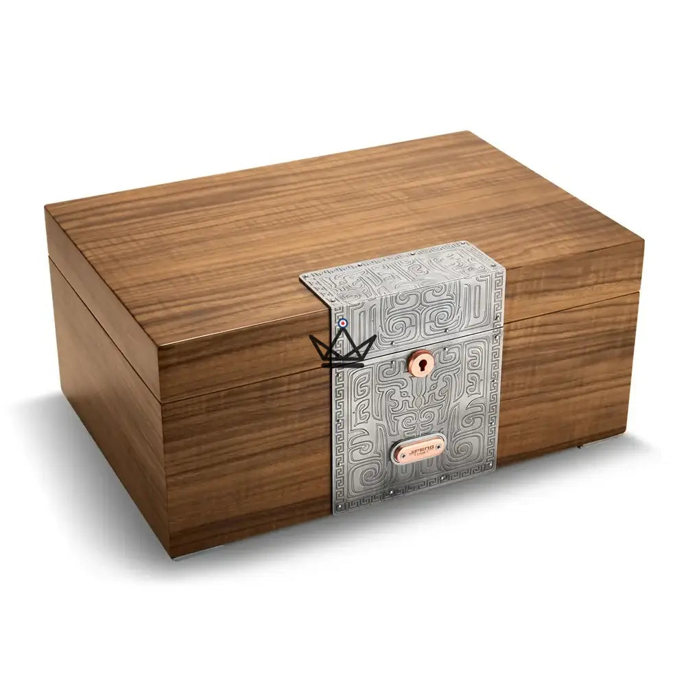 Designed for cigar connoisseurs, this humidor combines refined design and optimal functionality to deliver a premium storage experience. The marriage of solid wood and carved metal accents, available in gold and silver finishes, evokes a feeling of luxury and tradition.