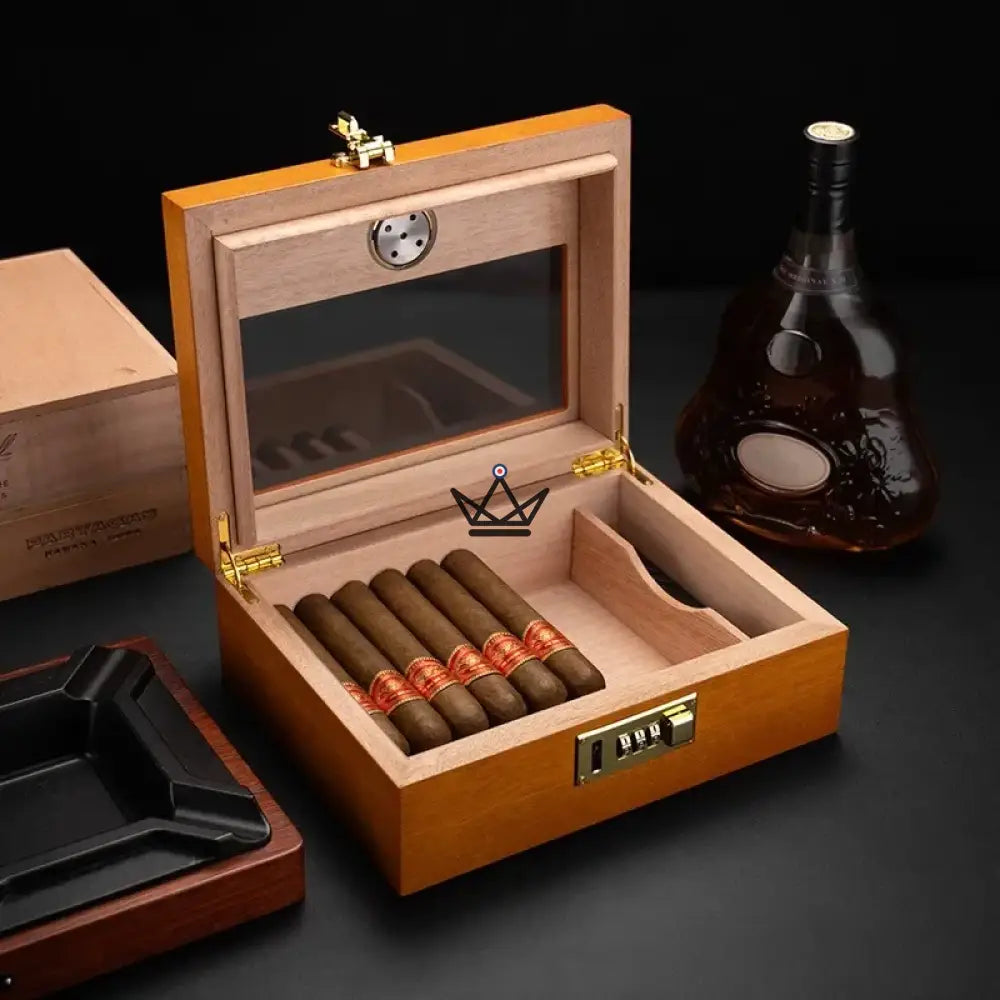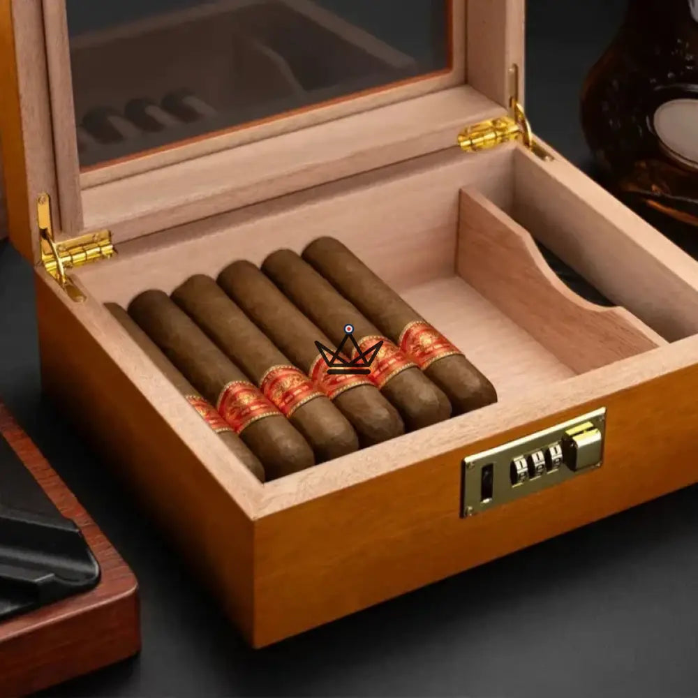 Discover the Cigar Humidor - Enigma Style , an innovation combining sophistication and safety for cigar lovers. Designed with an elegant glass design and a secret code closing mechanism and an integrated hygrometer on the lid, this humidor is the ideal choice for those looking to protect and display their cigars with distinction.