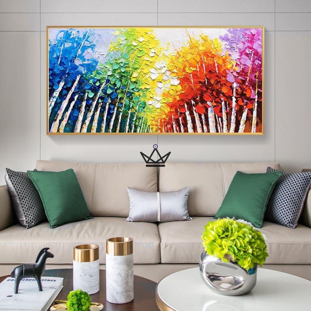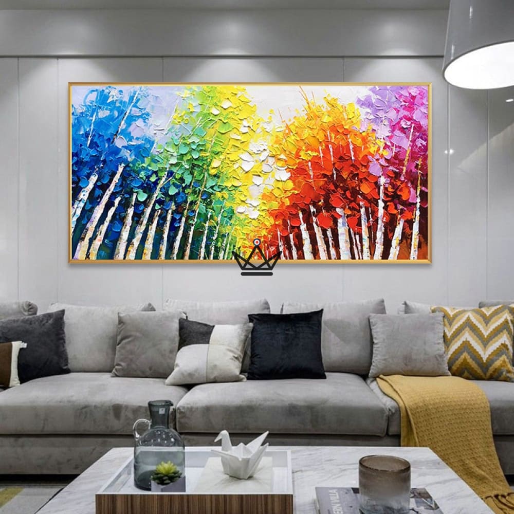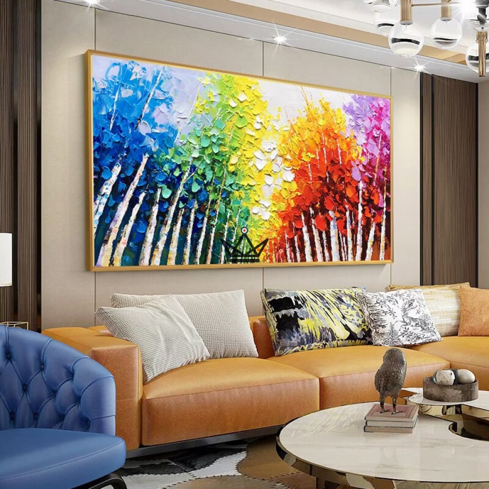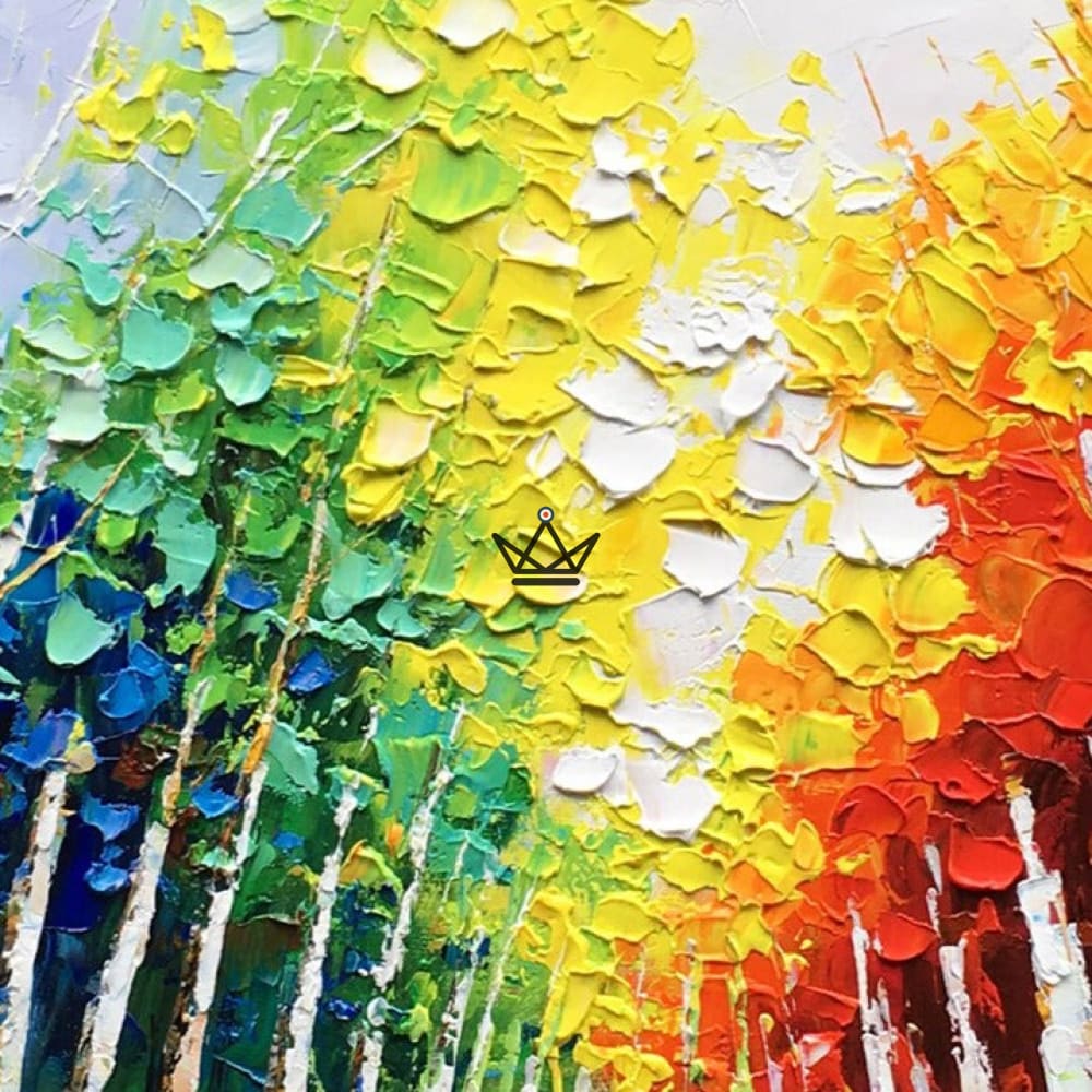 This canvas is hand-painted with a knife to create a unique textured effect that brings the modern, abstract forest to life. The vibrant, rich colors add an extra dimension to this contemporary artwork.