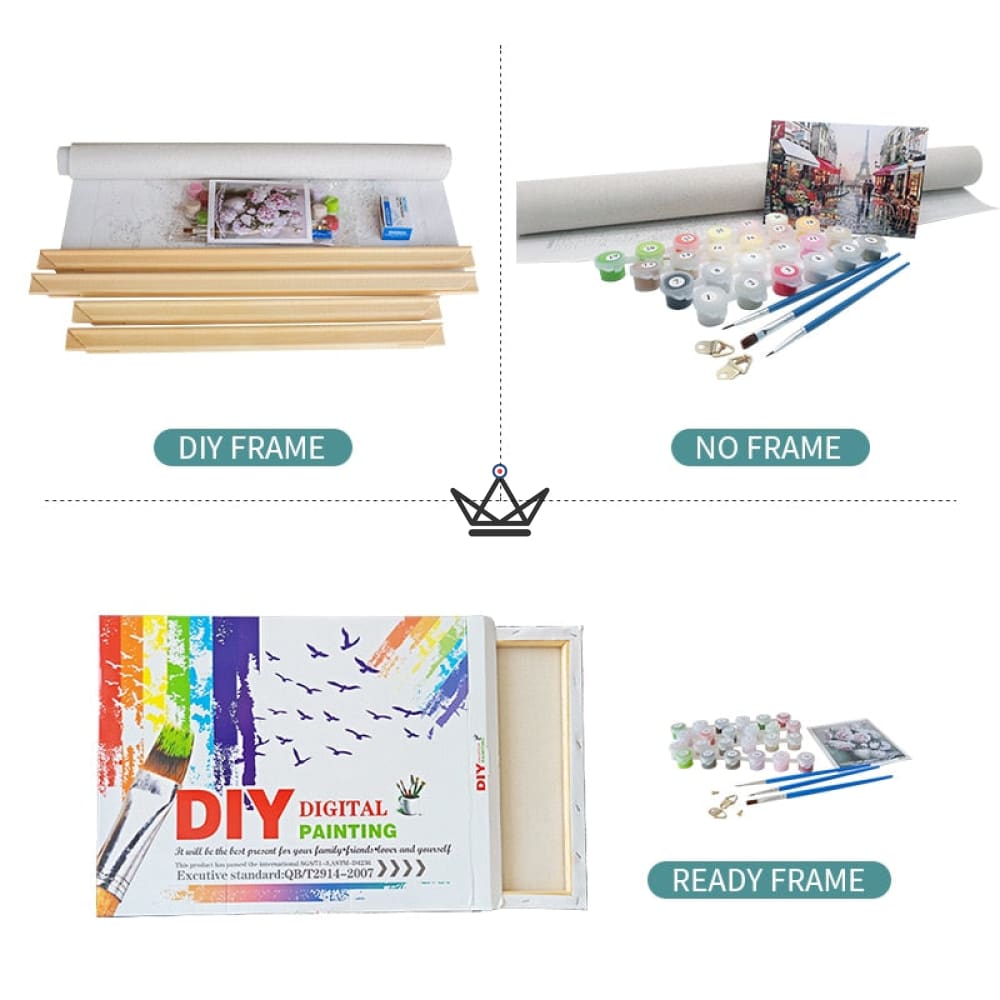 Canvas Pack with Wooden Frame: For DIY enthusiasts (Do It Yourself - DIY), this pack offers a complete experience. You will receive the printed canvas, numbered paint pots, brushes, and a wooden frame to assemble yourself. It is a perfect option for those who love to create from scratch and bring their masterpiece to life in an artisanal way.