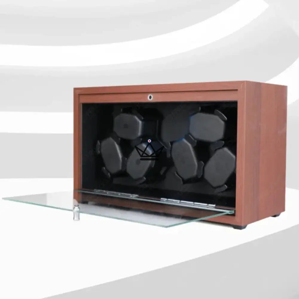 Ce remontoir dispose de six emplacements astucieusement disposés pour maintenir vos montres automatiques en parfait état de marche. Son couvercle en verre transparent permet une vue imprenable sur votre collection, tout en ajoutant une touche de sophistication à votre décor.