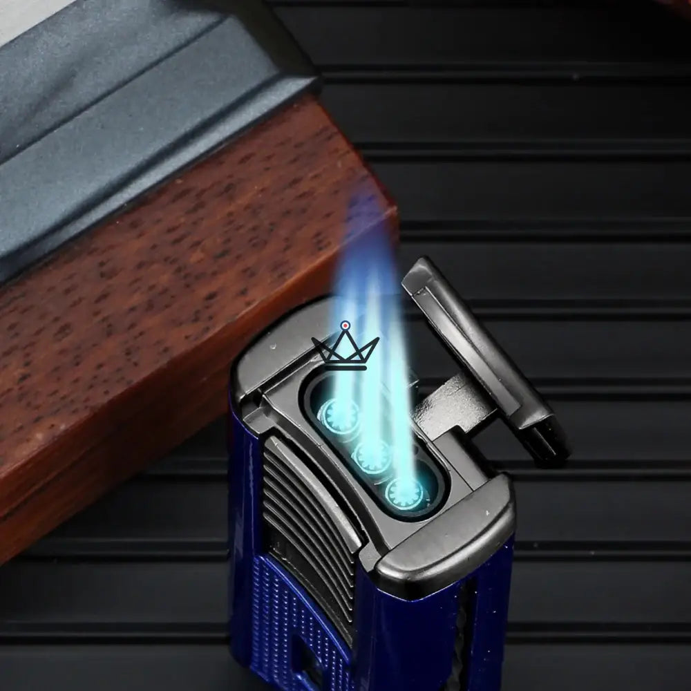 Le design moderne du briquet Praetor est proposé en quatre couleurs raffinées : Bleu royal, Or, Gris métallisé, et Vert émeraude, apportant une touche de luxe à votre rituel de fumeur.