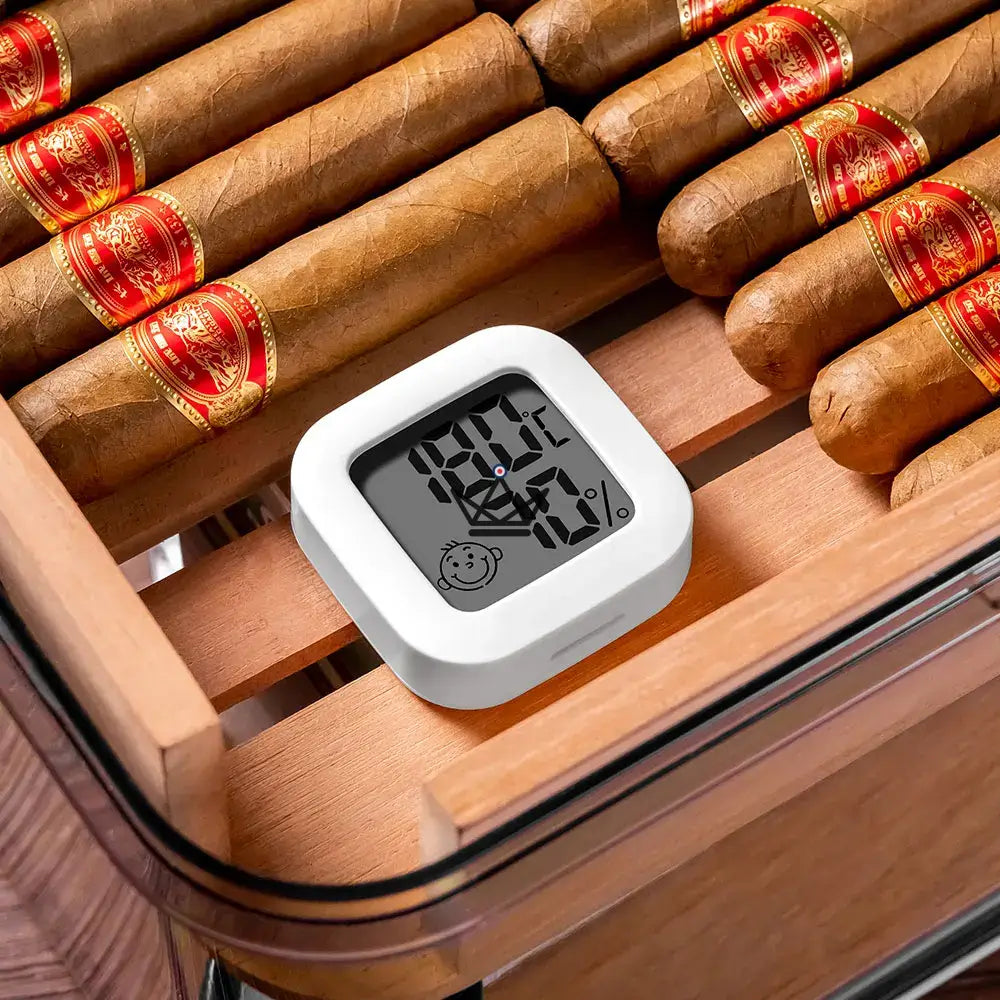 La Cave à Cigare - CRYSTAL TIME est équipée d'un hygromètre et d'un humidificateur, assurant un niveau d'humidité optimal pour préserver la fraîcheur et l'arôme de vos cigares.