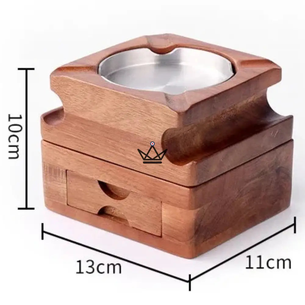L'élément supérieur du set, doté de puissants aimants pour une fixation sécurisée, comporte un cendrier en bois au centre duquel se trouve une coupelle en acier inoxydable, facile à nettoyer et résistante à la chaleur. Sur les côtés, deux emplacements sont judicieusement intégrés pour reposer vos cigares avec soin et élégance.