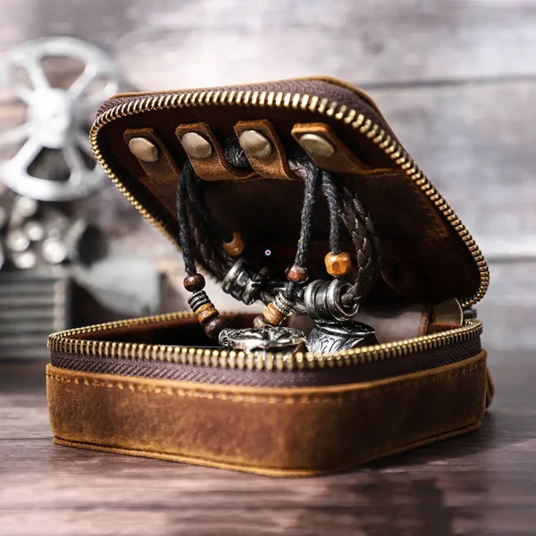 Diese aus hochwertigem Echtleder gefertigte Box vereint Vintage-Stil mit modernem Charme dank ihrer natürlichen Patina und des verstärkten Metallreißverschlusses. Im Inneren befindet sich ein weiches Samtfach zur Aufbewahrung Ihres Schmucks sowie:
