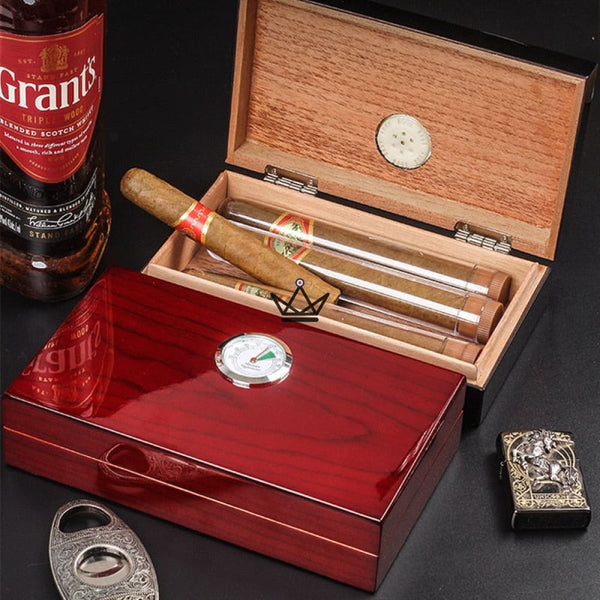 Gönnen Sie sich diesen Zigarren-Humidor aus Zedernholz und geben Sie Ihren Zigarren einen sicheren und luxuriösen Ort, um sie in ihrem optimalen Zustand aufzubewahren. Verleihen Sie Ihrer Leidenschaft für Zigarren mit diesem hochwertigen Accessoire einen Hauch von Raffinesse.