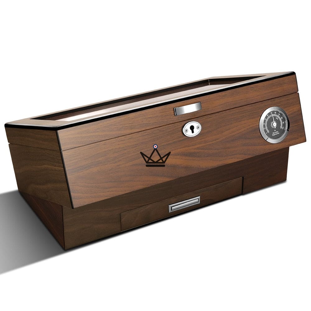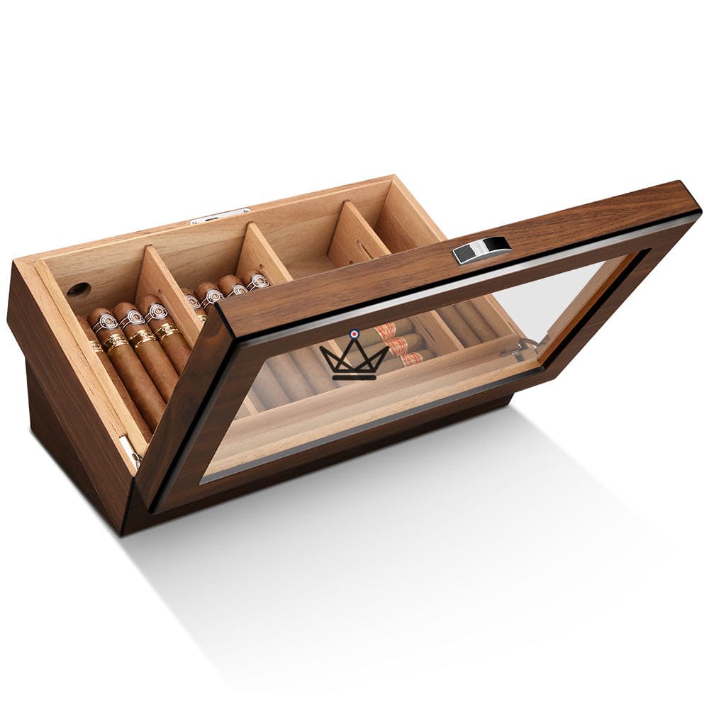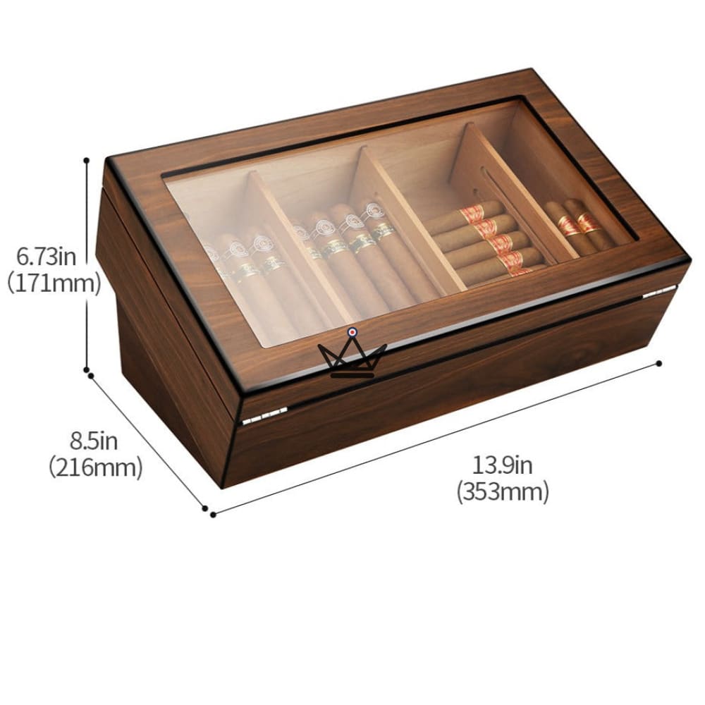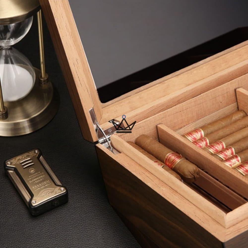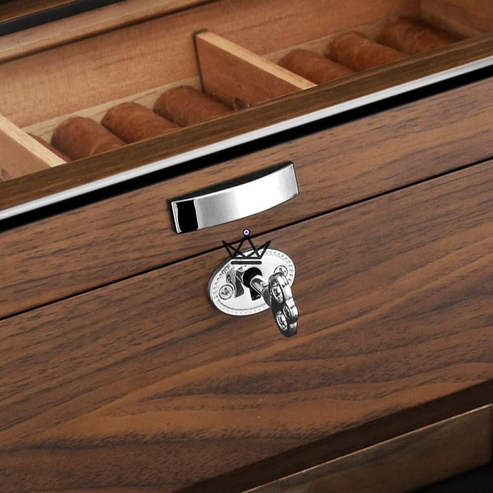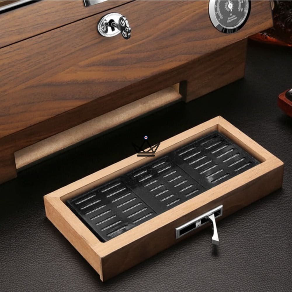 Im Inneren finden Sie drei herausnehmbare Trennwände, mit denen Sie Ihre Zigarren nach Ihren Wünschen organisieren können. Sie können problemlos auf jede Zigarre zugreifen, ohne den Rest der Sammlung zu stören. Darüber hinaus beherbergt die clevere Schublade am Boden des Humidors den Luftbefeuchter und ermöglicht so einen bequemen Zugang und eine einfache Wartung, um die ideale Luftfeuchtigkeit aufrechtzuerhalten.