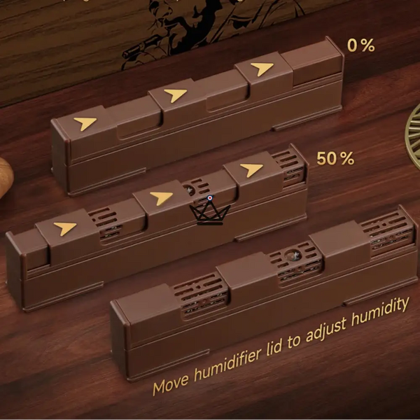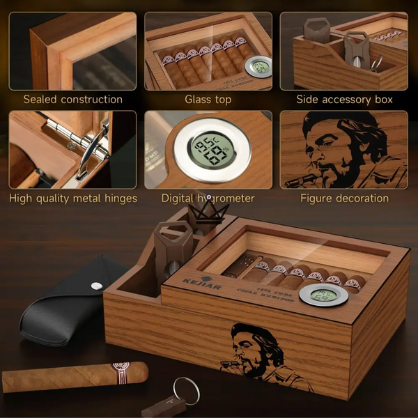 Ausgestattet mit einem Glasdeckel ermöglicht es Ihnen, Ihre Zigarren sofort zu betrachten, während gleichzeitig eine perfekte Abdichtung gewährleistet ist. Sein integriertes digitales Hygrometer garantiert eine präzise Kontrolle der Luftfeuchtigkeit, während sein einstellbarer Gel-Luftbefeuchter es Ihnen ermöglicht, Ihre Zigarren in einer idealen Atmosphäre zwischen 65 % und 72 % zu halten.