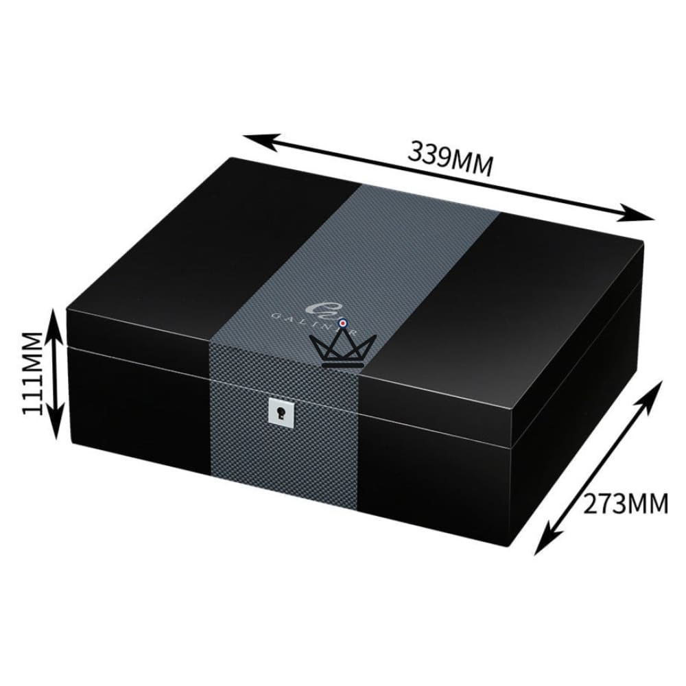 Sein einzigartiges Design verbindet gekonnt Tradition und Moderne mit seinem Carbonfaserband, das ihm ein entschieden modernes Erscheinungsbild verleiht. Diese ästhetische Note verleiht dieser außergewöhnlichen Zigarrenkiste einen Hauch von Raffinesse.