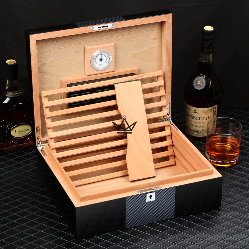 Entdecken Sie den Zigarren-Humidor DUAL CARBON, eine elegante und moderne Kiste zur Aufbewahrung Ihrer Lieblingszigarren. Mit seinem großzügigen Fassungsvermögen für bis zu 70 Zigarren bietet dieser Humidor ausreichend Platz für eine vielfältige Sammlung.