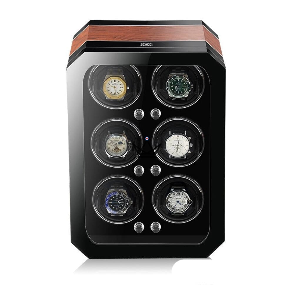 Jeder Uhrenbeweger ist aus edlem Holz gefertigt und mit einer Innenausstattung aus echtem Leder ausgestattet, was hochwertige Handwerkskunst und makellose Verarbeitung widerspiegelt. Diese mit unabhängigen Rotoren ausgestatteten Uhrenbeweger ermöglichen es Ihnen, die Aufzugsgeschwindigkeit jeder Uhr mithilfe von 5 einstellbaren Rotationsmodi individuell anzupassen.